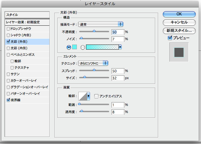 前回やったレイヤースタイル変更を選択して光彩をクリックするだけです。