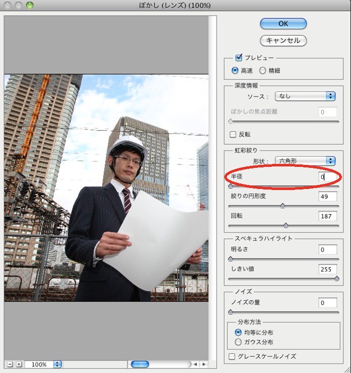 この画面で、半径の数を調整し、先ほど選択した背景をぼかします。現在、数字は0なので、元の画像のままです。
