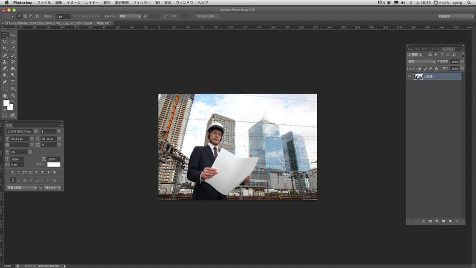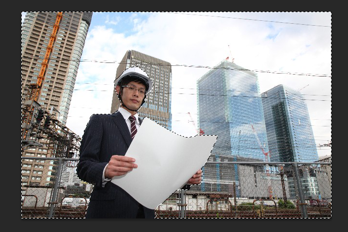 男性が立っている後ろにはハッキリと建物が写っています。このまま画像が使える場合もあれば、場所を特定されるのが困る場合もあります。そんな時にPhotoshopのぼかし機能が便利です。