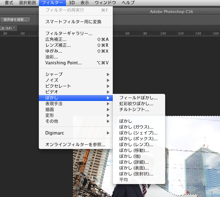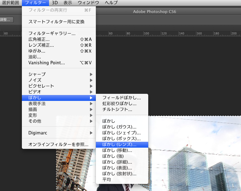 「フィルター」→「ぼかし」と進むと、たくさん選択肢がでてきます。今回は「ぼかし(レンズ)」を使用します。
