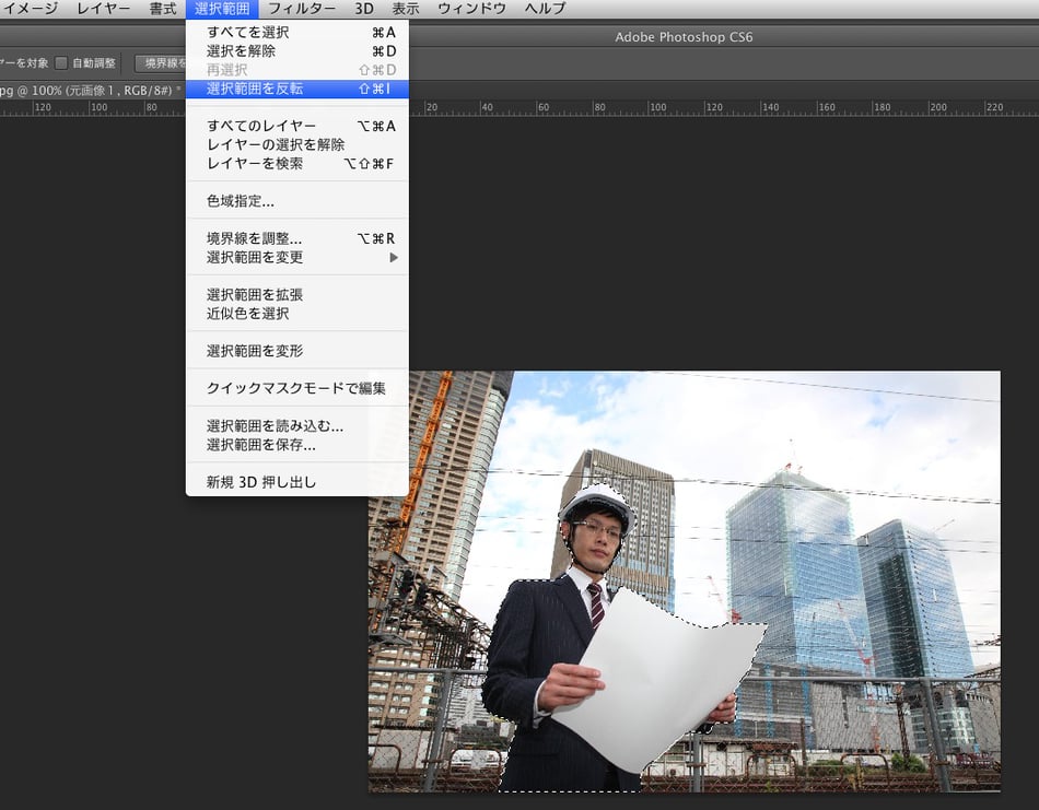 次に、「選択範囲」→「選択範囲を反転」と進み、選択します。
