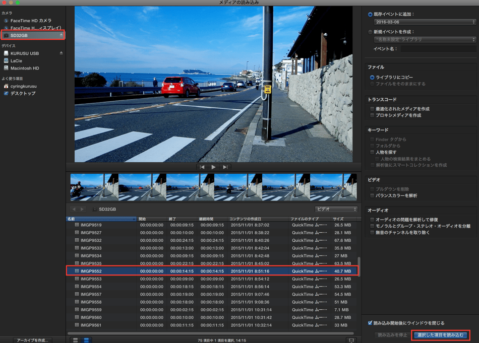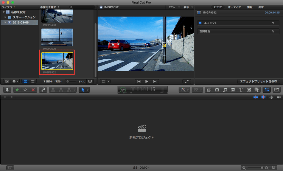 ビデオカメラや一眼レフカメラ、iPhoneなどで撮影した映像があると思いますが、Final Cut Pro Xにこの素材を読み込みます。
