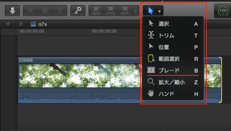 この状態でタイムライン上のクリップの切りたい部分をクリック