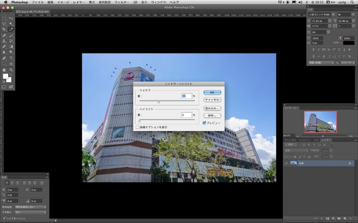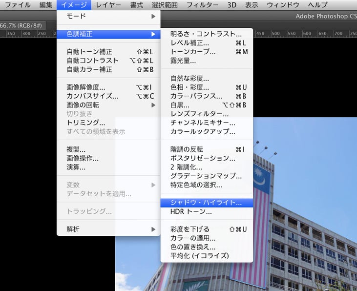 〈イメージ〉→〈色調補正〉→〈シャドウ・ハイライト〉と進んでいきます。