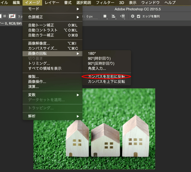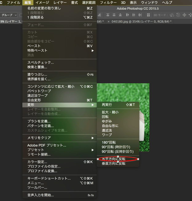 <編集>→<変形>→<水平方向に反転>と進みます。