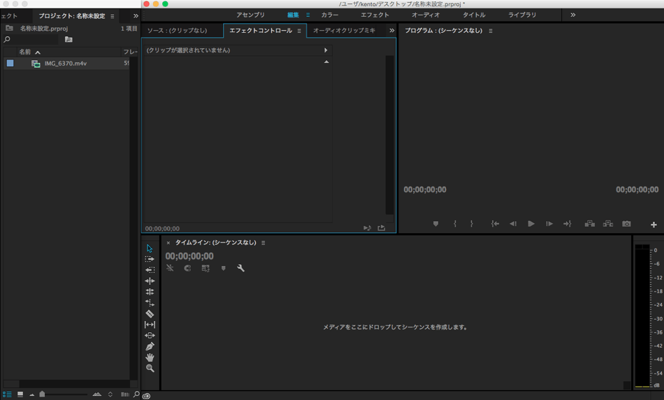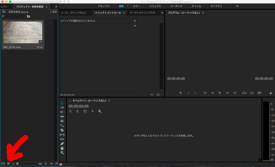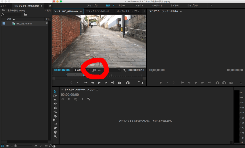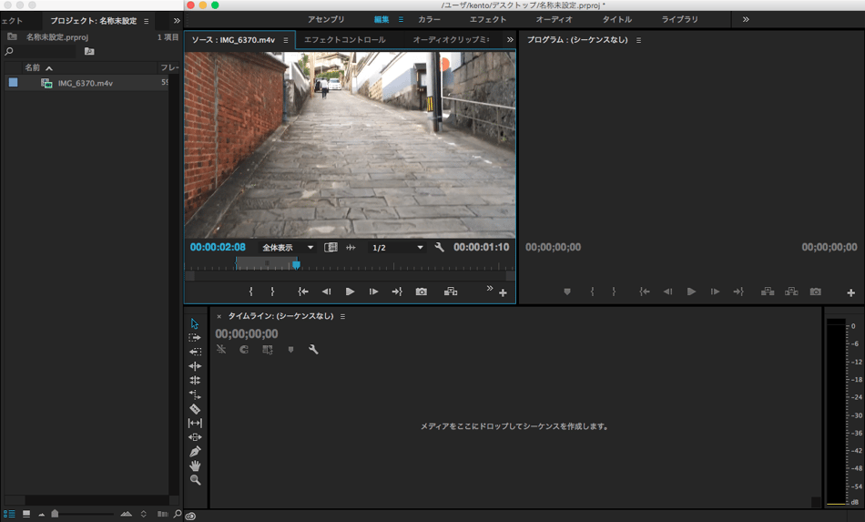 そこに直接素材をドラッグ、もしくはダブルクリックや右クリックからの読み込み(command+iでもできます)で、素材を取り込みます。