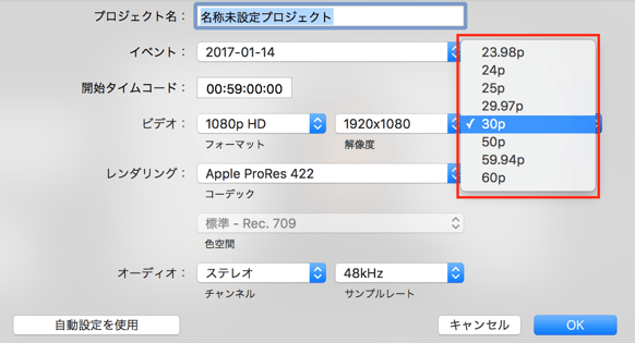 ここで29.97pを選択すると「ドロップフレーム」という単語が出てきますが、これも今回は説明を省略させて頂きます。
