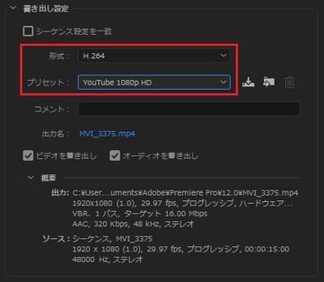 ネット上での動画公開の場合であれば、形式「H.264」で、プリセットを「Youtube 1080p HD」にしておけば、最近のPCなら、ほとんどの