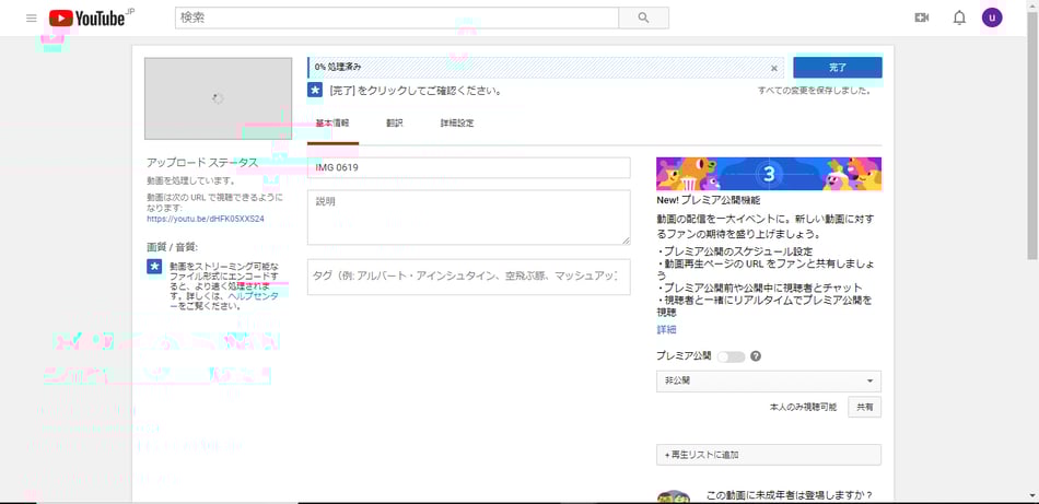 これが「100%」になり「処理済み」と表示されればアップロード完了となり、動画の投稿が完了します。