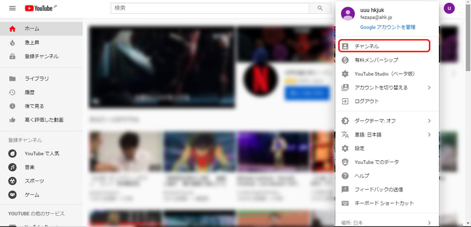 ① 前回と同様にYoutubeのページから自分のアカウントにログインします。