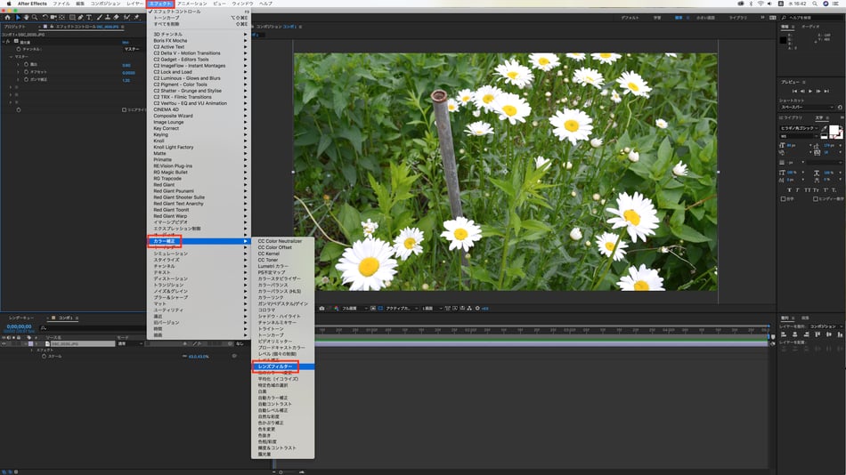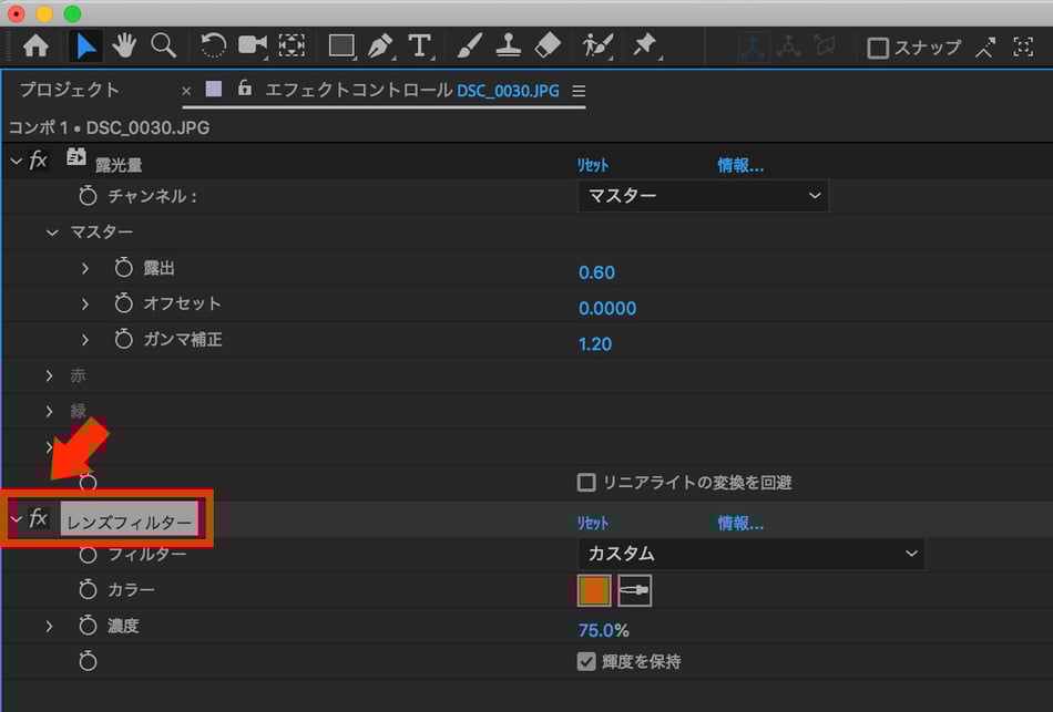 エフェクト>カラー補正>レンズフィルター を選択します。