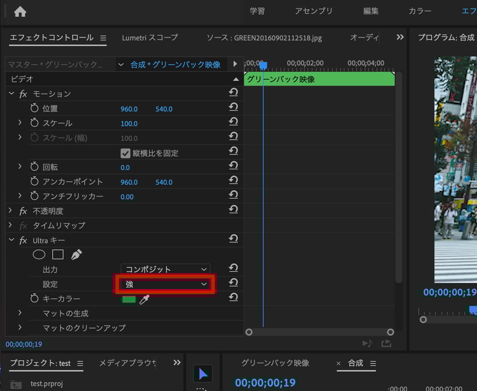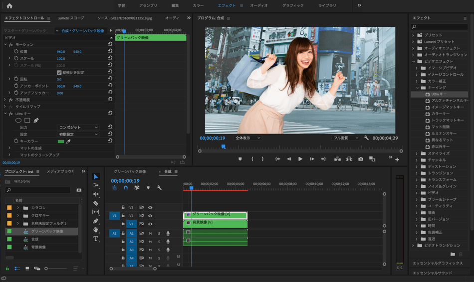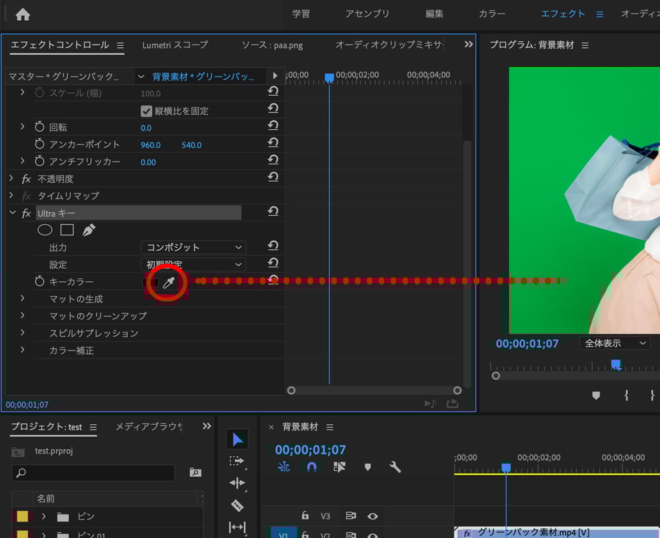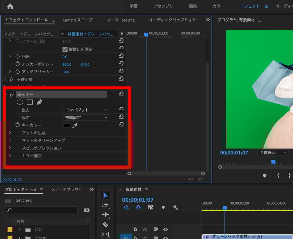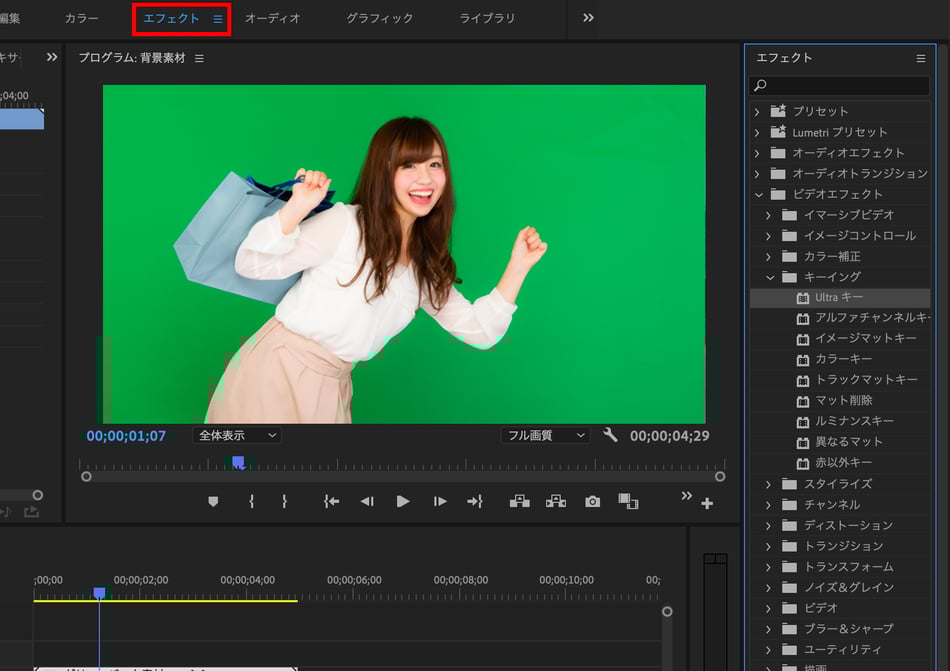 6. 画面左上にある「エフェクトコントロール」から、「Ultraキー」の項目を選びます。