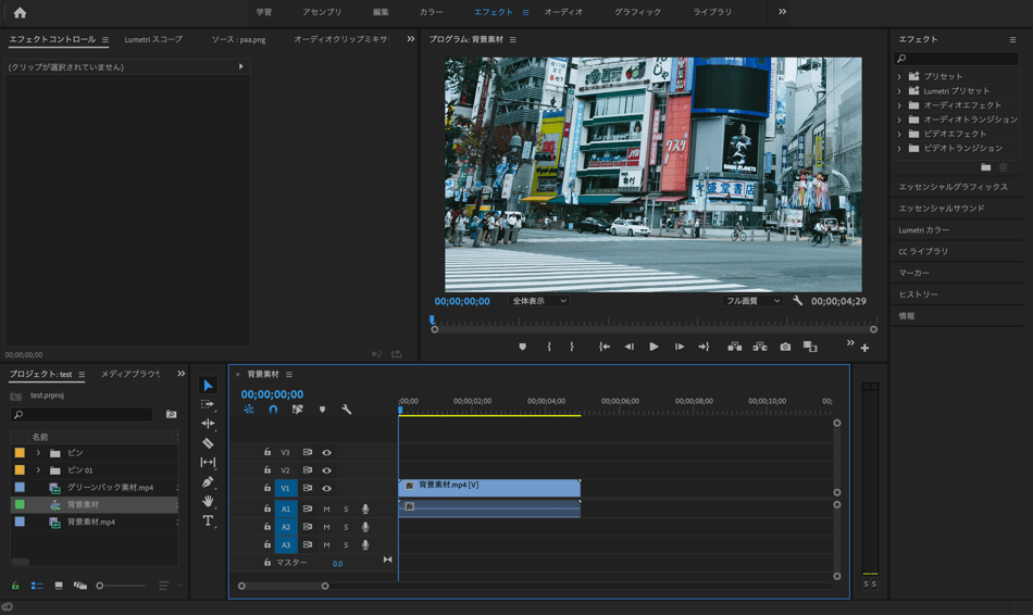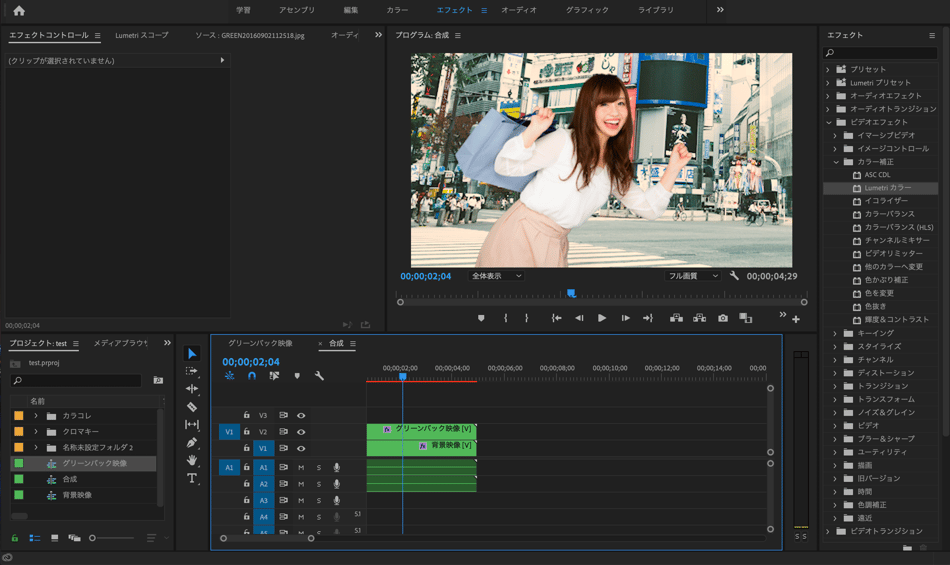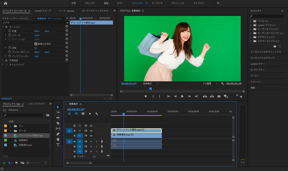 1. 背景映像とグリーンバック映像をPremiere Pro CCに読み込みます。