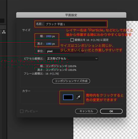 平面の大きさも、コンポジションの大きさと同じか、少し大きいくらいに設定しておくと、不自由なく作業できます。