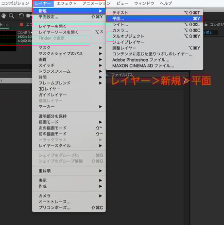 [1] 上部メニューから、レイヤー>新規>平面 を選択し、新規の平面レイヤーを作成します。