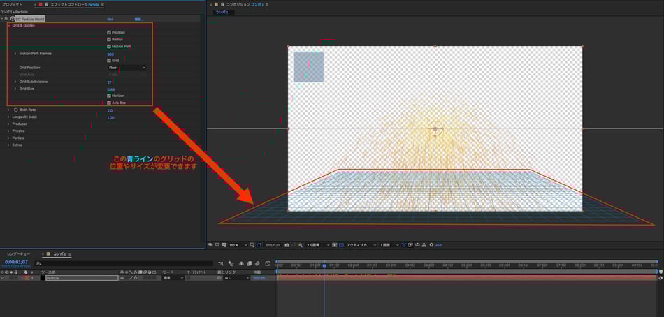 平面レイヤーにエフェクトを割り当てた後、キーボードのスペースキーを押すと、動くパーティクルエフェクトを確認することができます。