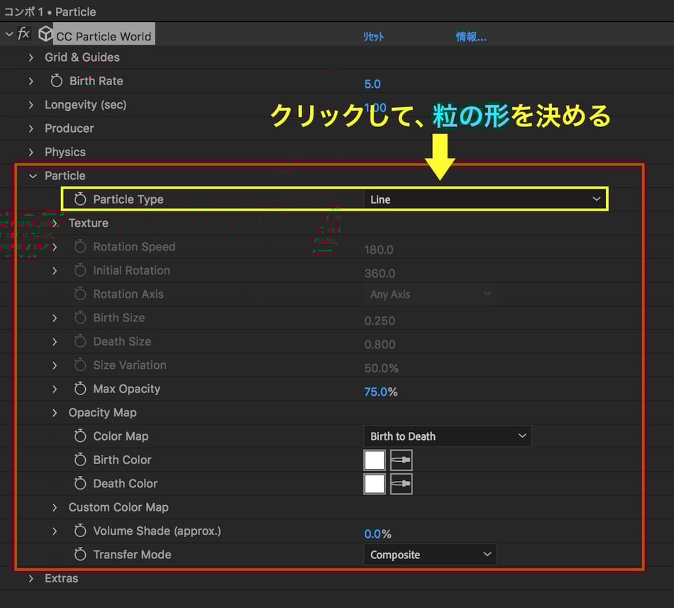 パーティクルの、粒の色や形を調整する項目です。