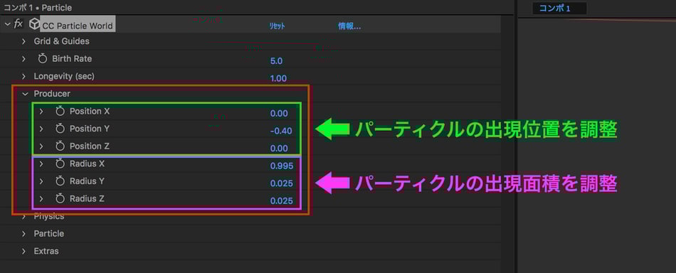 ・「Position」は、パーティクルの出現位置を調整する項目です。