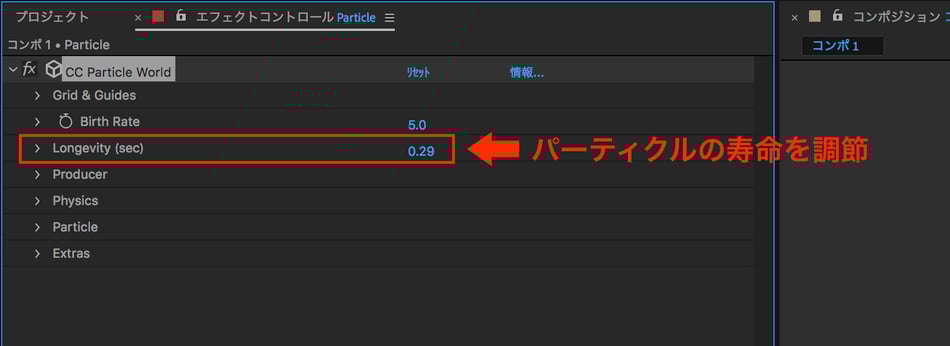 パーティクル一粒の寿命を調節する項目です。