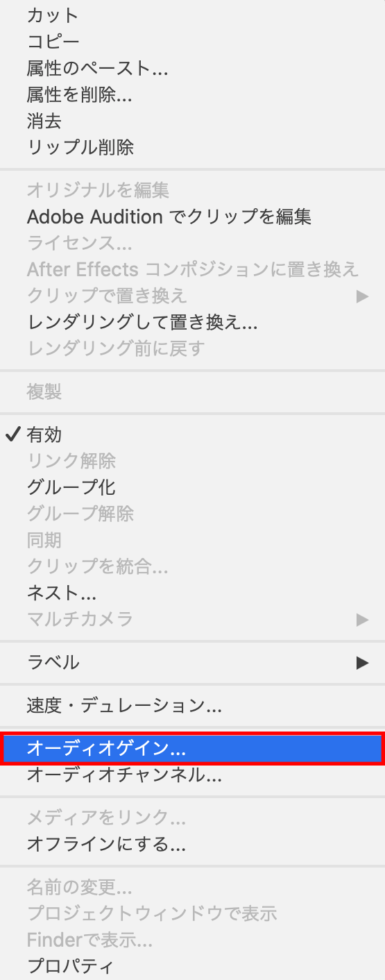 ② 右クリックでサブメニューを開いて、「オーディオゲイン」を選択します。