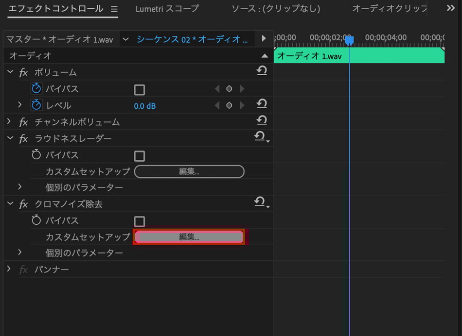 ②「エフェクトコントロール」パネルの「クロマノイズ除去」からカスタムセットアップの左側にある「編集」をクリックします。