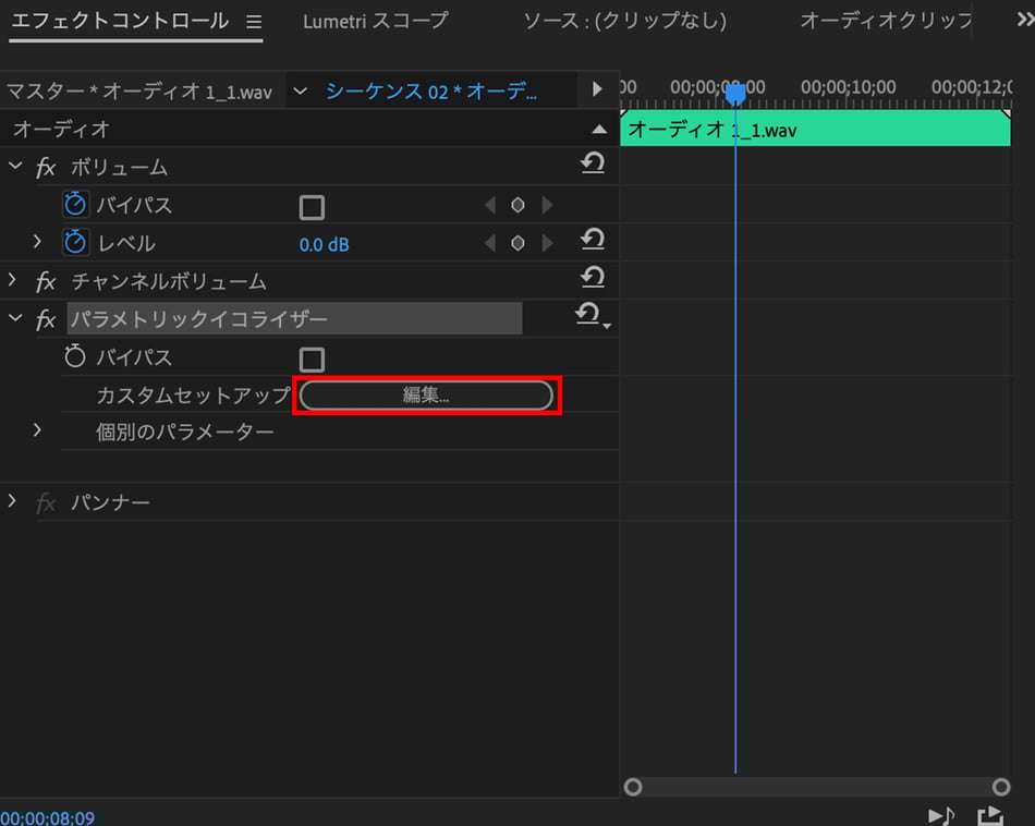 ②「エフェクトコントロール」パネルにある「パラメトリックイコライザー」から