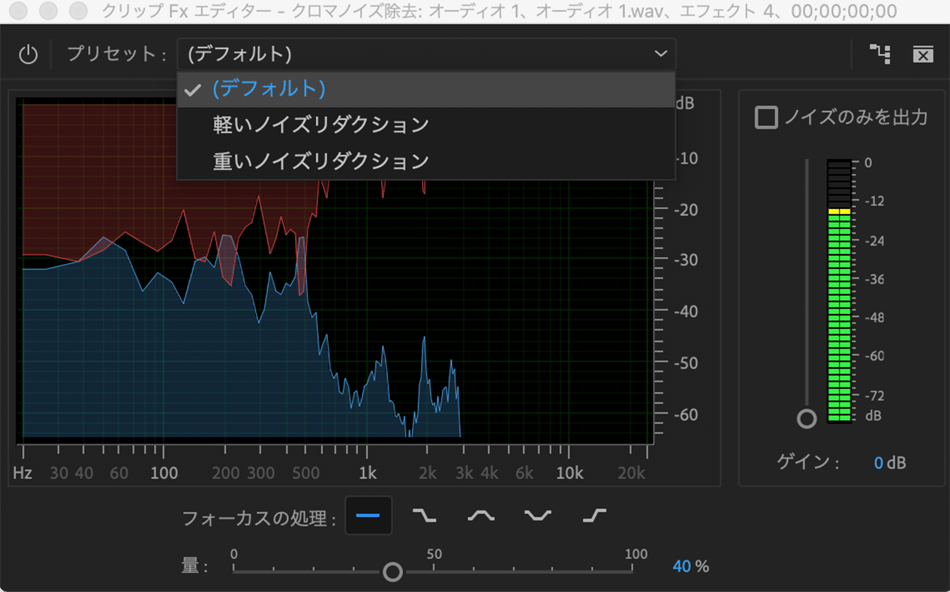 *プリセットの中に「軽いノイズリダクション」と「重いノイズリダクション」があり、どちらかを選択することで簡単に背景ノイズを