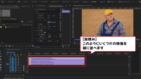こちらもまずは使いたい映像を段積みし、それぞれの映像にリニアワイプを適用します。