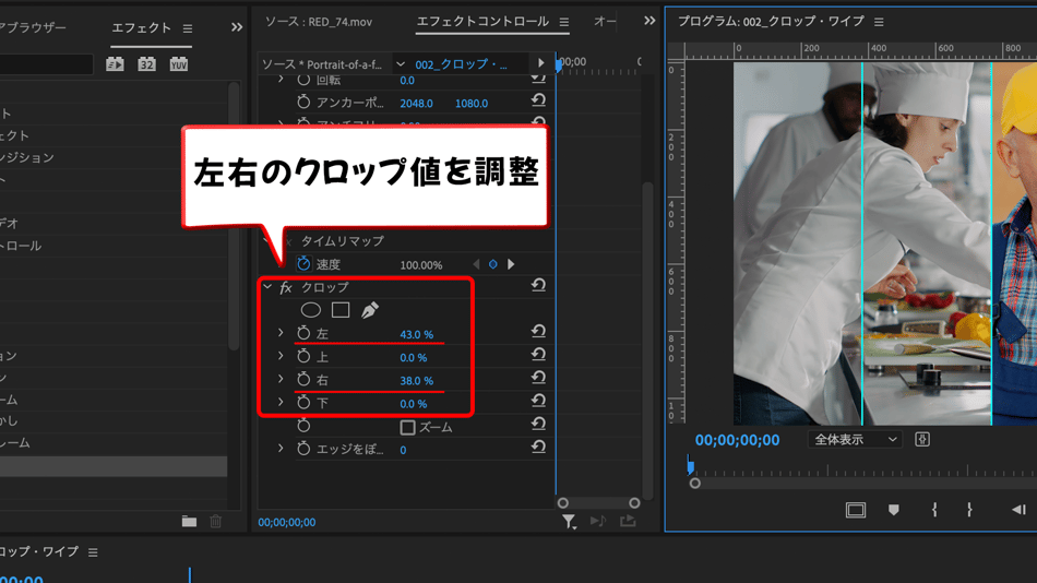 「エフェクト」の中から、「ビデオエフェクト」→「トランスフォーム」から「クロップ」を映像に適用!