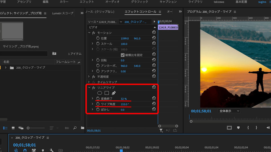 そして、リニアワイプではここの「変換終了」と「ワイプ角度」を調節します。