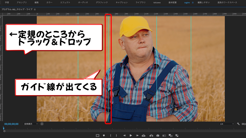 ガイド線が引けたら、動かないようにするため、「表示」から「ガイドをロック」にチェックしておいてください