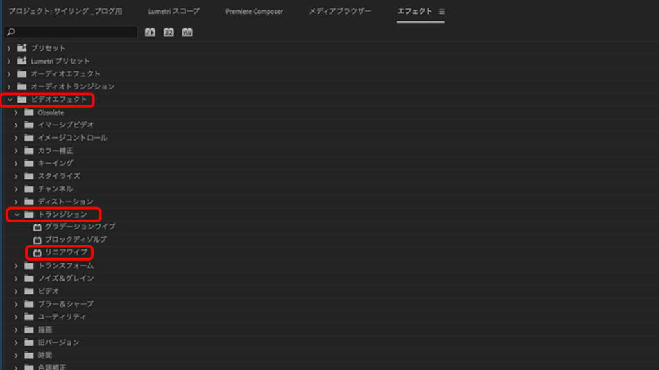 「ビデオエフェクト」→「トランジション」の中にある「リニアワイプ」です。