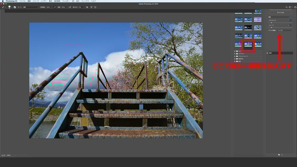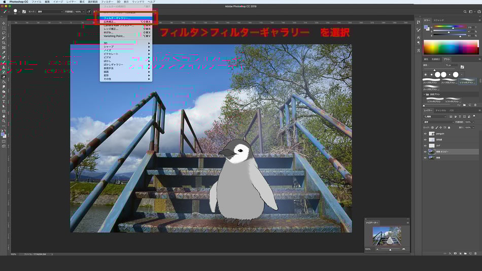 写真のレイヤーを選択した状態で、フィルタ>フィルターギャラリーを選択します。