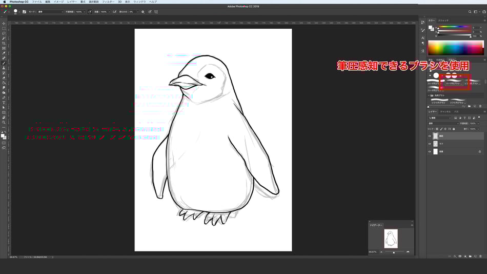 ここで使用するブラシは、筆圧感知のついたブラシを使用すると、
