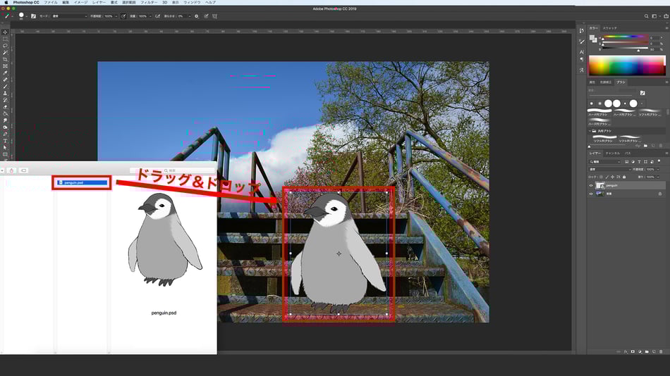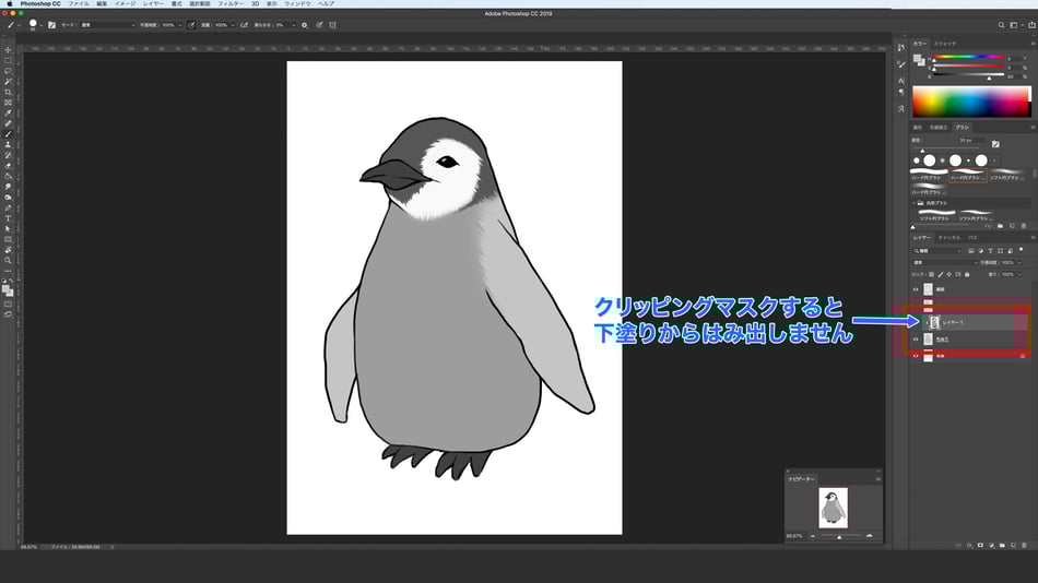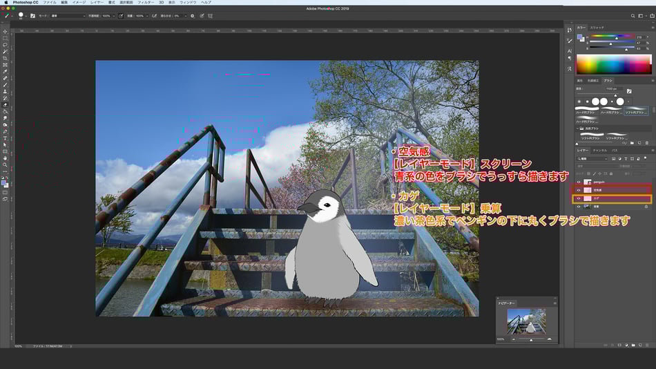 さらにペンギンを背景に馴染ませるには、カゲと空気をうっすら描き込むと、ほんの数分の手間だけで、
