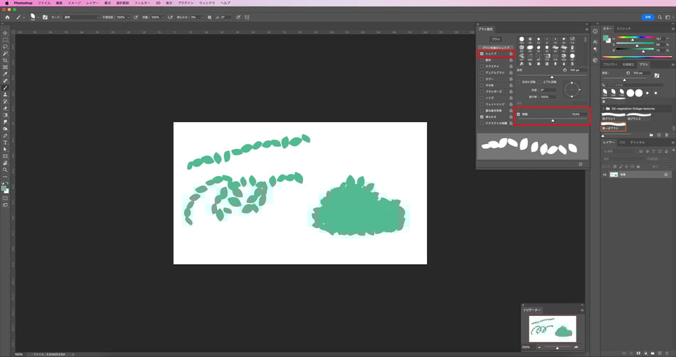 【ブラシ先端のシェイプ】の、【間隔】の数値を上げて、葉っぱ一つ一つの間隔をあけます。