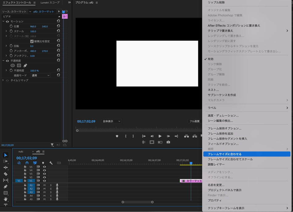 そんな時に、多くの人がエフェクトコントロールからスケールの数字を調整して画面サイズを揃えているかと思いますが、そんな時に役立つのが「フレームサイズに合わせる」です。