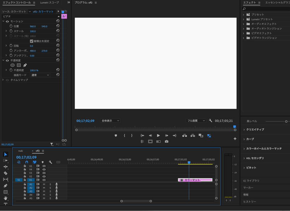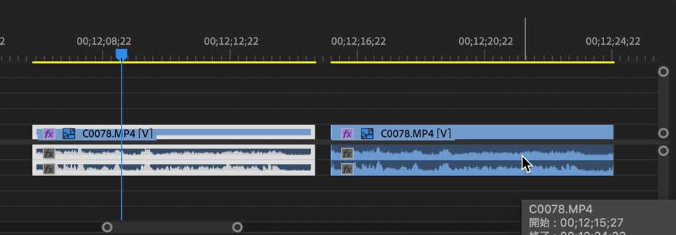 ディゾルブをかけたい素材を選んで、「command + D」もしくは「Ctrl + D」を入力することで、一発でクロスディゾルブをかけることができます。